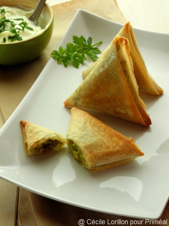 5. Pour réalisez les triangles de bricks : Pliez une feuille en 2 puis rabattez la partie arrondie de manière à formez un long rectangle. Placez 1 cuillère à soupe de farce sur une extrémité et rabattez vers le haut pour former un triangle puis vers le bas et ainsi de suite. Huilez toutes les surfaces puis enfournez pour 15 minutes.