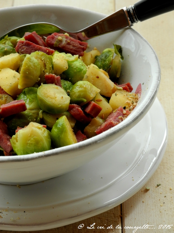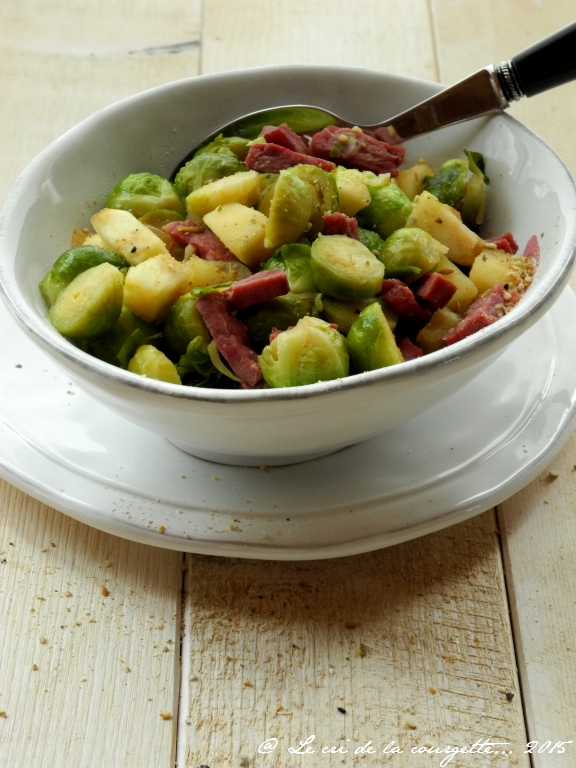 Choux de Bruxelles aux pommes, avec ou sans lardons de canard Mar 04, 2015 // Le salé..., Légumes & Cie, Les "sans"..., Salé, Salé, Salé, Sans gluten, Sans lactose & caseine, Sans oeufs // Cécile LorillonJ’aime bien, au coeur de l’hiver cuisiner ces petits choux de Bruxelles qui malheureusement en rebutent plus d’un. Chez moi aussi c’est parfois difficile de convaincre mes enfants de planter la fourchette dans ces mignons. Je tente donc à chaque fois de réaliser des recettes « attractives » qui pousseront leur curiosité jusqu’à goûter et, si j’ai de la chance, finir leur assiette. Il y a quelques temps déjà ma recette de Choux de Bruxelles farcis à la coppa et au fromage de Brebis avait eu un franc succès. Cette fois-ci je me suis laissée emportée par le sucré salé en découvrant il y a quelques jours la recette de Létitia du blog Piment Oiseau qui nous a proposé des Choux de Bruxelles à la mangue et au magret fumé. Une de ces recettes qui vous font envie de croquer dans ces jolis petits choux même si vous n’êtes pas adepte au départ. Je m’en suis donc inspirée pour composer la recette du jour !