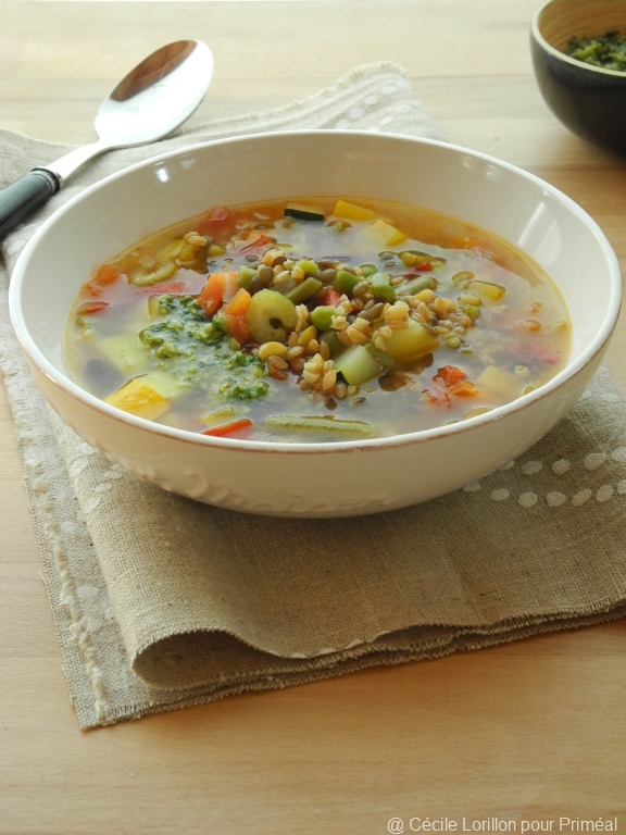 Minestrone au mescia de Petit épeautre de Haute-Provence Oct 04, 2014 // Céréales & légumineuses, Entrées chaudes, Le salé..., Légumes & Cie, Les "sans"..., Salé, Salé, Sans lactose & caseine, Sans oeufs, Toutes les recettes bio // Cécile LorillonJ’ai réalisé cette soupe minestrone pour le blog Priméal. Elle est parfaite pour démarrer l’automne sans pour autant oublier les beaux et bons légumes de l’été. Réalisée avec du Mescia de Petit Epeautre elle est riche en saveurs et se suffit à elle-même pour un repas complet simple et réconfortant.