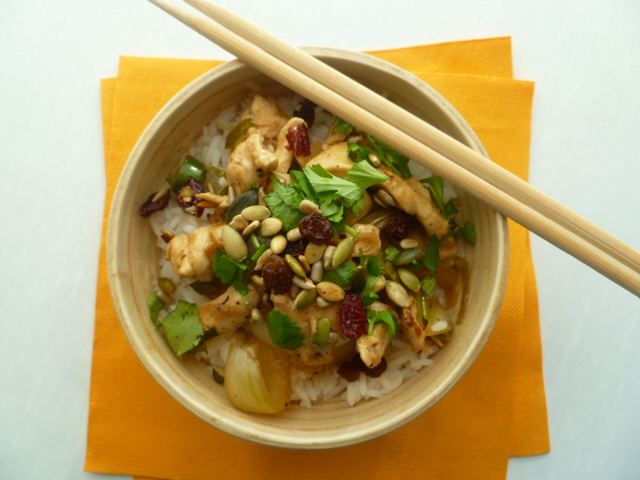 Il vous faut : 400 g de blanc de poulet / 1 petit poireau / 2 oignons / 2 gousses d’ail / 1 cm de racine de gingembre / 1 bouquet de coriandre /4 cuillères à soupe de sauce soja / 1 cuillère à soupe de vinaigre de riz / 3 cuillères à soupe de fécule de pomme de terre / 1 cuillère à café de miel / 1 cuillère à café de sucre roux /2 poignées de graines mélangées (courge, tournesol, pignons, …) / 1 poignée de cramberries /1 poignée de raisins secs /huile de tournesol / sel / poivre