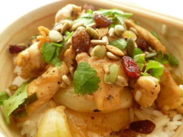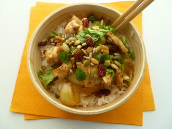Poulet sauté au gingembre et aux graines Jan 27, 2012 // Le salé..., Les "sans"..., Salé, Salé, Sans gluten, Sans lactose & caseine, Toutes les recettes bio, Viandes, oeufs // Cécile LorillonUn petit plat aux saveurs asiatiques qui ne laisse personne indifférent, ça vous tente ? Pour cela, il vous faut le moelleux d’un poulet, le croquant de graines variées, le sucré de quelques fruits secs, l’exotisme du gingembre et de la coriandre et la douceur d’un riz al dente ! Ajoutez quelques légumes, une sauce pour lier le tout et le tour est joué. Et pour les quantités, pas d’inquiétude, la recette est juste en dessous !