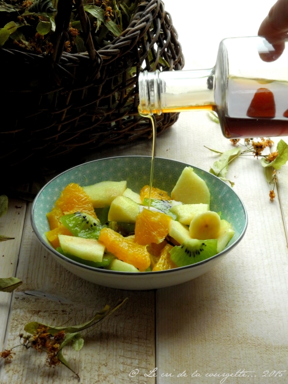 Aujourd’hui c’est le tilleul que je mets dans mon dessert. Une simple salade de fruits de saison arrosée d’un sirop de tilleul.