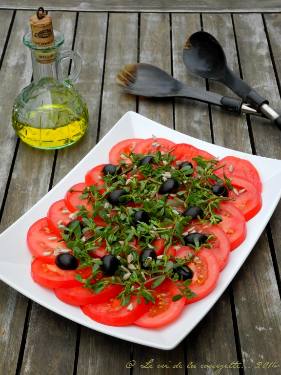 Il vous faut : 3 à 4 tomates / 2 belles poignées de pourpier / 8 olives noires / 1 cuillère à soupe de graines de tournesol / huile de colza / vinaigre balsamique / sel marin / poivre