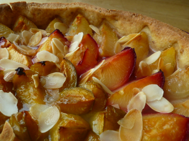 4. Disposez ensuite les prunes dans le fond de tarte et saupoudrez-les de sucre. Enfournez la tarte pour 30 min. Faites griller les amandes dans une poêle bien chaude puis parsemez-en la tarte à la sortie du four.