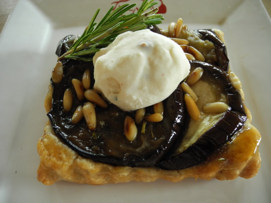 7 Commentaires à "Tarte Tatin d’aubergines et pignons {crème glacée au chèvre et au basilic}"