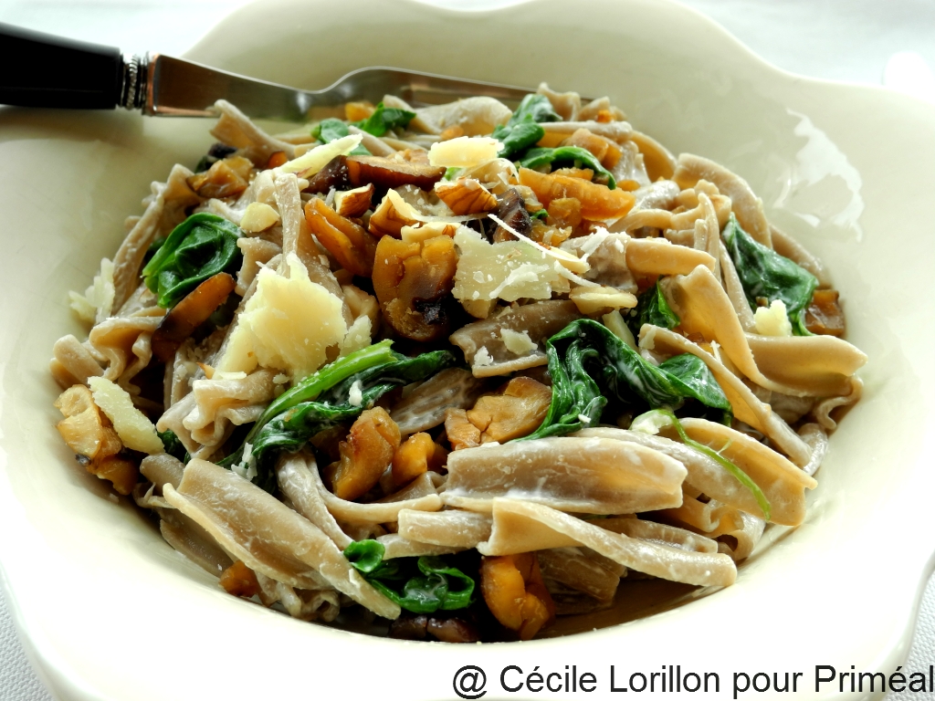 Ingrédients : 250 g de tortils aux cèpes Priméal / 150 g de feuilles d’épinards / 150 g de châtaignes cuites / 1 gousse d’ail / 25 g de parmesan / 15 cl de soja cuisine / 1 poignée de noisettes / sel / poivre / huile d’olive