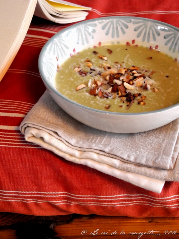 Velouté de brocolis à l’amande et au parmesan Jan 09, 2016 // Entrées chaudes, Extras, Le salé..., Légumes & Cie, Les "sans"..., Salé, Salé, Sans gluten, Sans oeufs, Toutes les recettes bio // Cécile LorillonCe velouté de brocolis est devenu ma soupe fétiche de l’hiver. Très doux, très réconfortant et vraiment savoureux, j’aime le déguster au coin du feu. Il faut dire que l’hiver quand le froid est bel et bien installé je ne suis pas une maman modèle quand il s’agit de passer à table. Je rejoins un peu trop souvent, entre chaque plat, mon coin favori tout près du poêle à bois, un petit coffre bas recouvert d’un coussin bien moelleux. Comment résister ! Les enfants ont fini par comprendre que c’était vraiment plus fort que moi et en sourient tendrement ou plaisantent à ce sujet ! Il faut dire qu’une fois le repas terminé je n’ai plus vraiment de chance de pouvoir l’occuper mon petit banc, ils se le disputent pour pouvoir jouer ou bouquiner près de la chaleur bienfaisante du poêle.